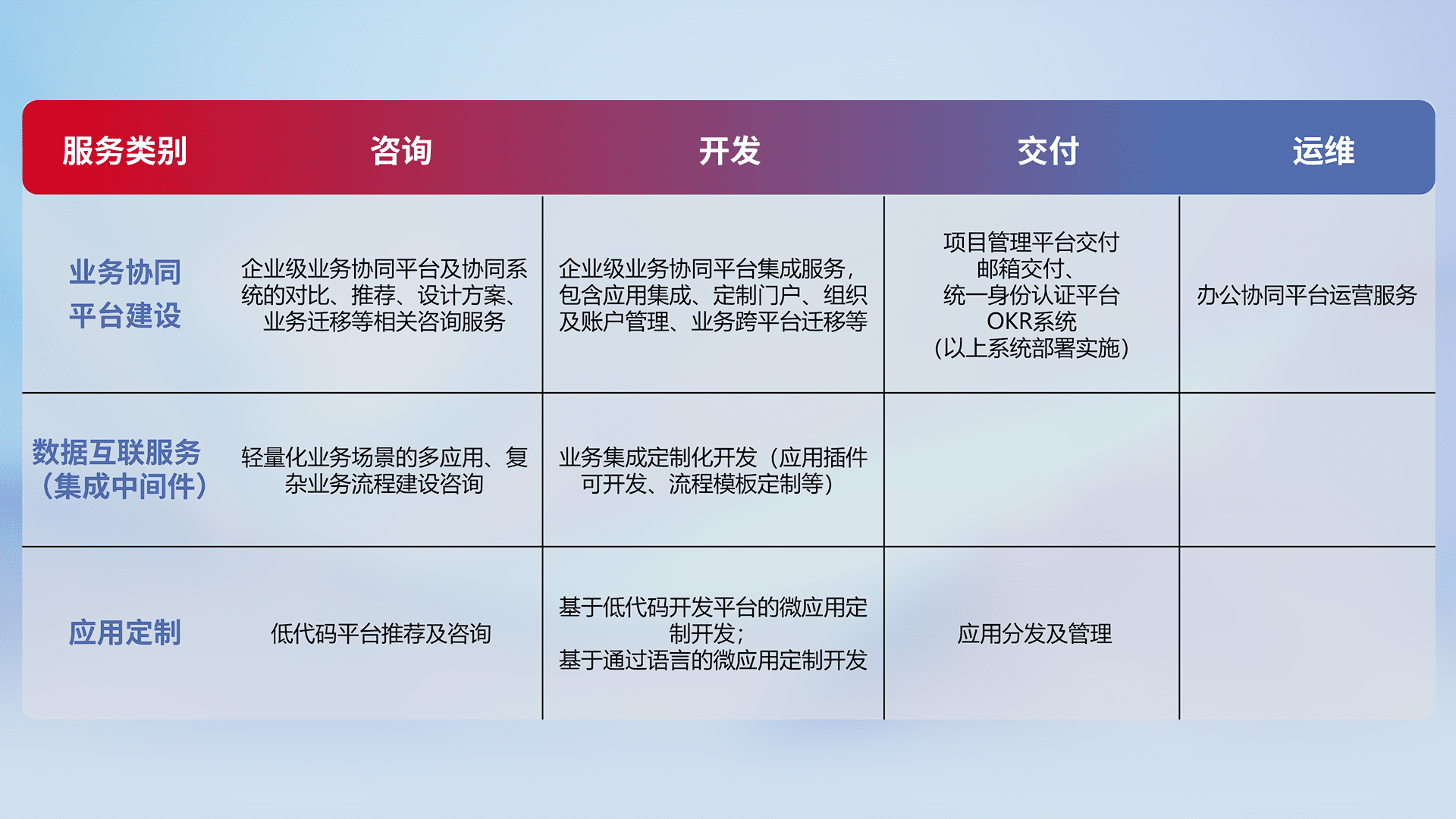 针对钉钉、、、、企微、、、、IDaas等平台级产品提供产品的规划、、、方案、、、、交付、、定制化开发等服务,,,,实现如统一协同办公、、、智能客户服务、、、、混合会议管理、、、、智能数据查询、、等业务场景,,实现数字化转型。。。